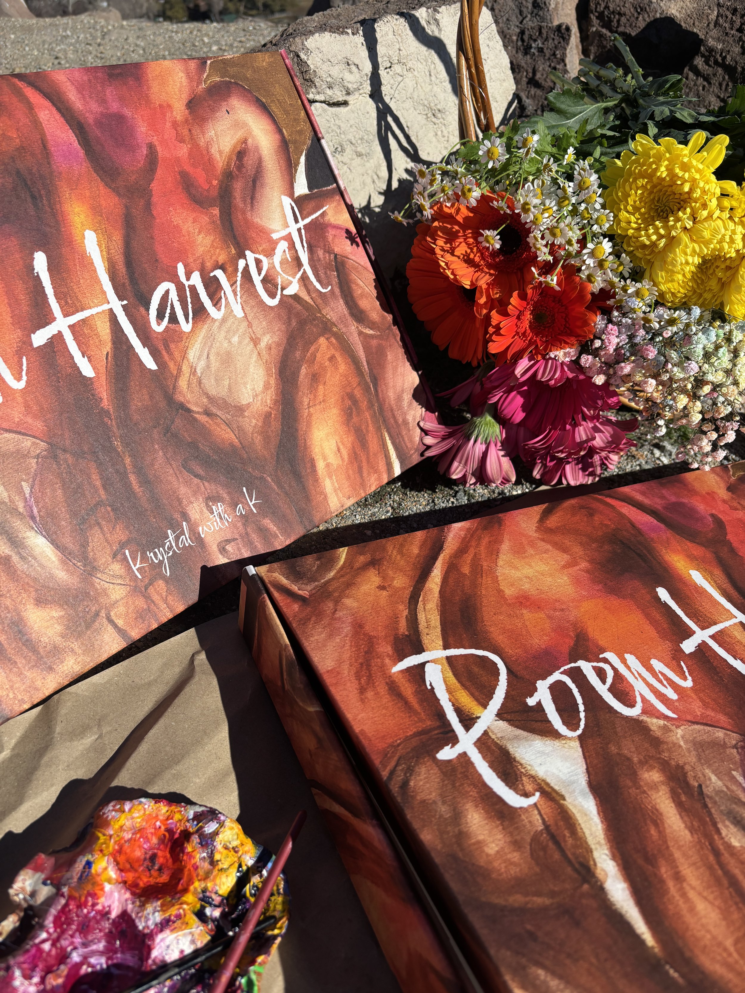 Krystal with a K has built her arts career in a multifaceted way. She has years of painting, film directing, acting and project management under her belt and has yet to find the desire to create with only one medium. Just as humans are most well loved and understood in their complexity, it is her belief that art is also best expressed in complexity. Poem harvest for the consumer is a great story that you can then purchase to receive a painting, a poem and a print. But that is only one layer.